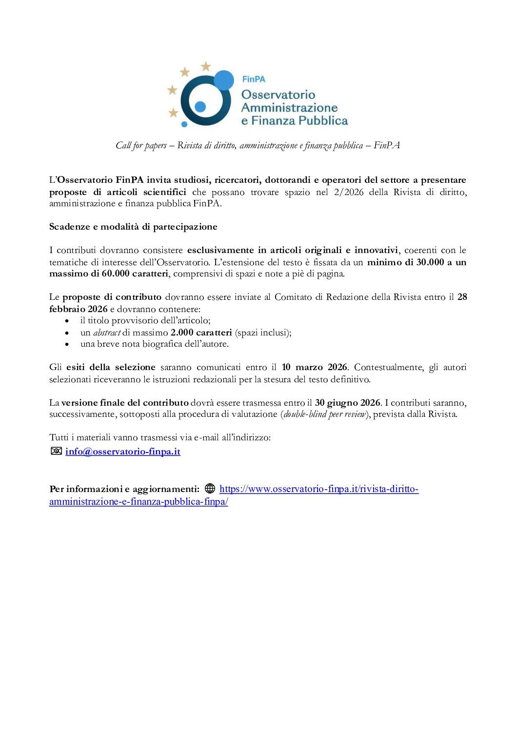 L’Osservatorio FinPA invita studiosi, ricercatori, dottorandi e operatori del settore a presentare proposte di articoli scientifici che possano trovare spazio nel 2/2026 della Rivista di diritto, amministrazione e finanza pubblica FinPA. Scadenze e modalità di partecipazione I contributi dovranno consistere esclusivamente in articoli originali e innovativi, coerenti con le tematiche di interesse dell’Osservatorio. L’estensione del testo è fissata da un minimo di 30.000 a un massimo di 60.000 caratteri, comprensivi di spazi e note a piè di pagina. Le proposte di contributo dovranno essere inviate al Comitato di Redazione della Rivista entro il 28 febbraio...